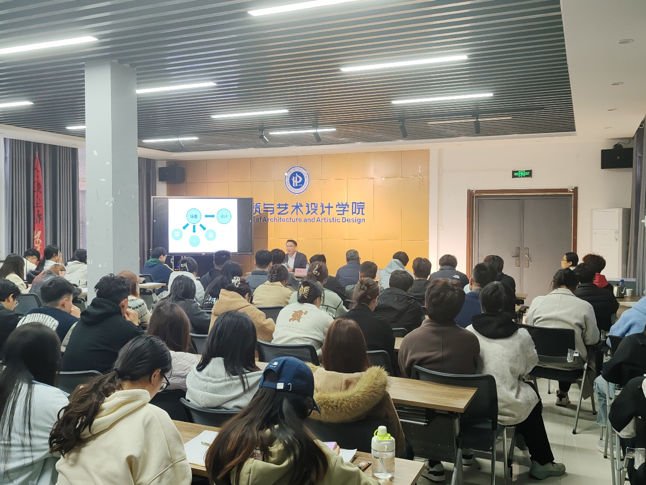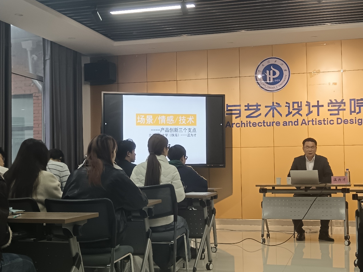 楼大会议室举办“感受 场景 技术——产品创新设计三个要素”主题讲座,特邀北京理工大学(珠海)温为才教授主讲,工业设计系师生到场参会。